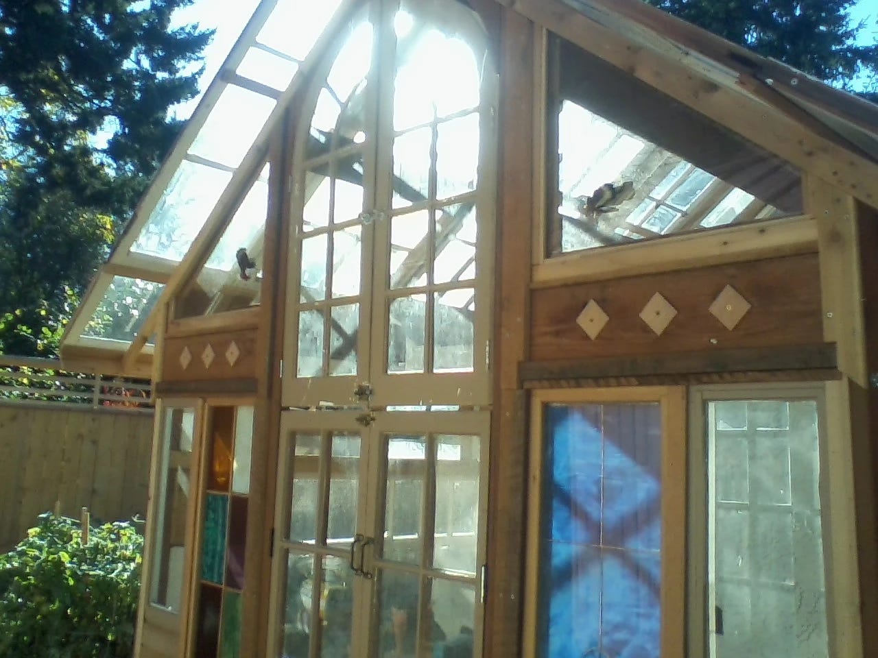 This one started out with a stained glass window her sister made years ago, but she couldn’t find a place to put it. Besides not being strong enough to stand on its own, for me to use it two panes of glass on either side had to be used in order to keep it from buckling. So after that, I made one for the other side from stained glass I got from Kory Dollar of Marvelous Mosaic.