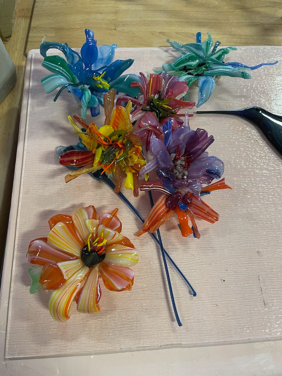 These glass flowers are made over several steps. It begins using this stuff called “Frit” which is a ground or powdered glass of various color. This frit is put in a vertical kiln and extracted from the bottom. The stripes are the result of carefully placed different color frit so that it melts into the desired pattern. Next it gets pulled and twisted into ribbon, rope or other crazy forms. It is a hot and tiring process, but when you see it issuing from the kiln and going from red-hot to cool into its final color and shape, it is really quite something to behold.