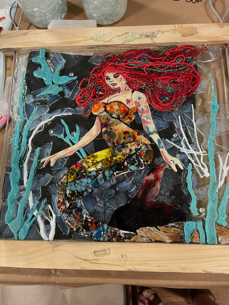 This stunning-to-be mermaid by Lori La Rue is made from several materials. It is part fused glass, melt glass (there is a difference), painted glass and beads - all on one of my sweetgum frames. It has yet to be grouted, but it is going to be a knockout! Lori is already a master and is one of the many super-talented people who come to classes by Kory Dollar of Marvelous Mosaic and Fine Art at The Manor in Deer Island, Oregon.
