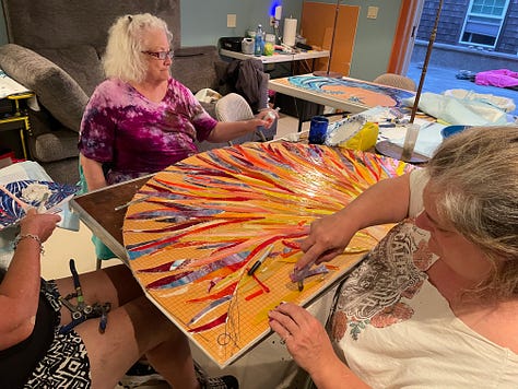 Kim’s husband Mark will make a bracket to hang the mosaic on the chimney. The image shows the South face where every passerby will be able to marvel at it and know an artist lives here. Good going, everyone, it’s going to be a banger!